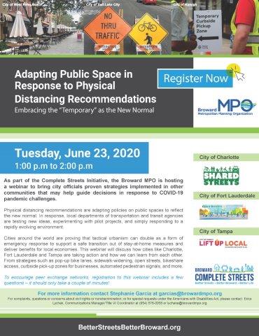 As part of the Complete Streets Initiative, the Broward MPO is hosting a webinar to bring City officials proven strategies implemented in other communities that may help guide decisions in response to COVID-19 pandemic. Registration Link