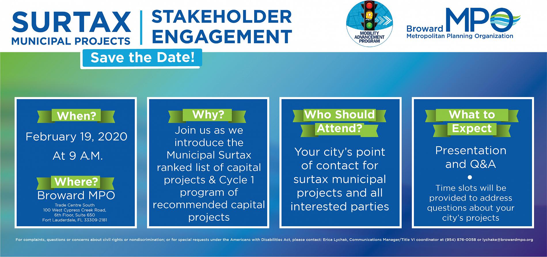 Surtax Municipal Projects Stakeholder Engagement From February 19, 2020 9:00 am until February 19, 2020 10:30 am At Broward MPO Office Share this page